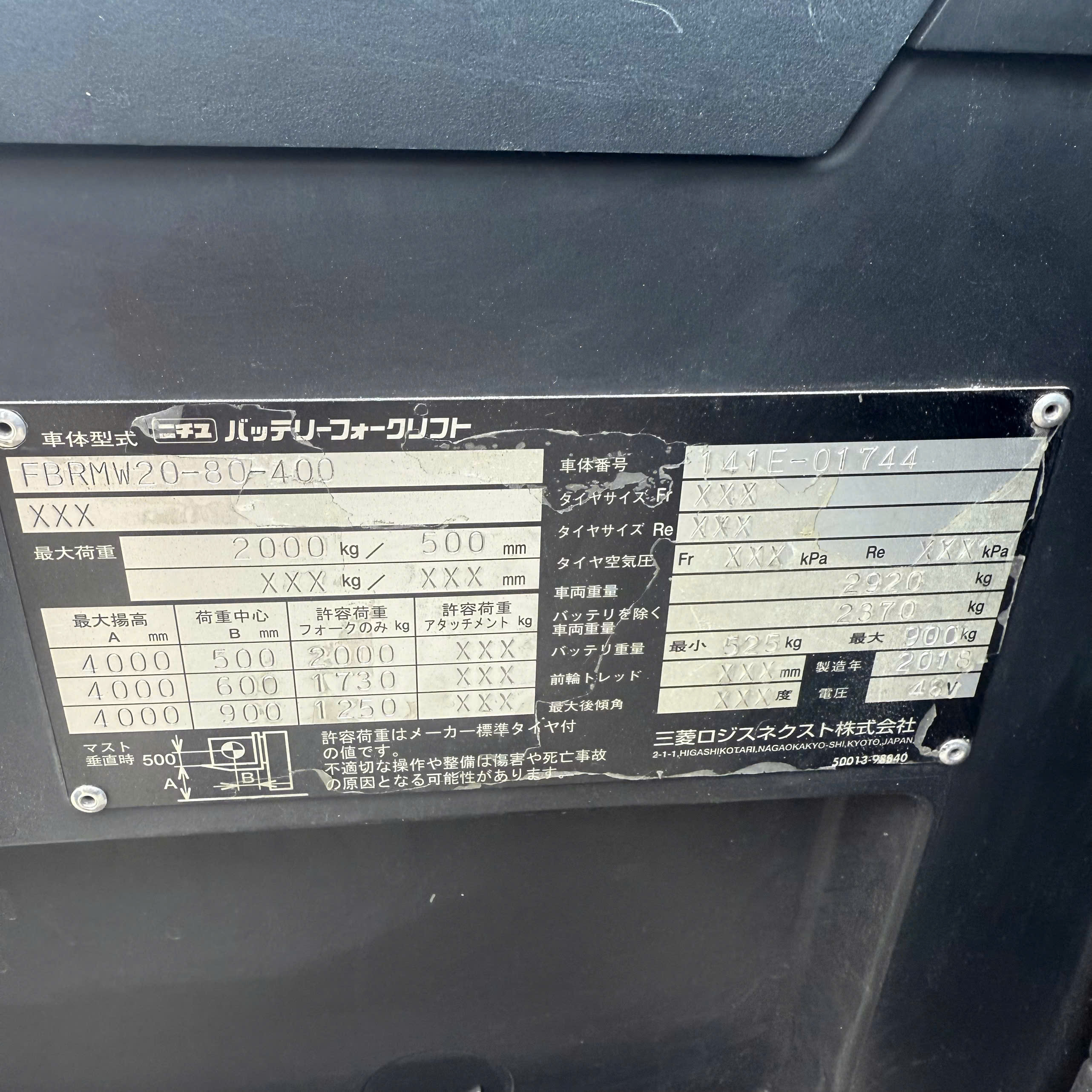 XE NÂNG ĐIỆN 2 TẤN ĐỨNG LÁI NICHIYU FBRMW20-80-400 141E01744